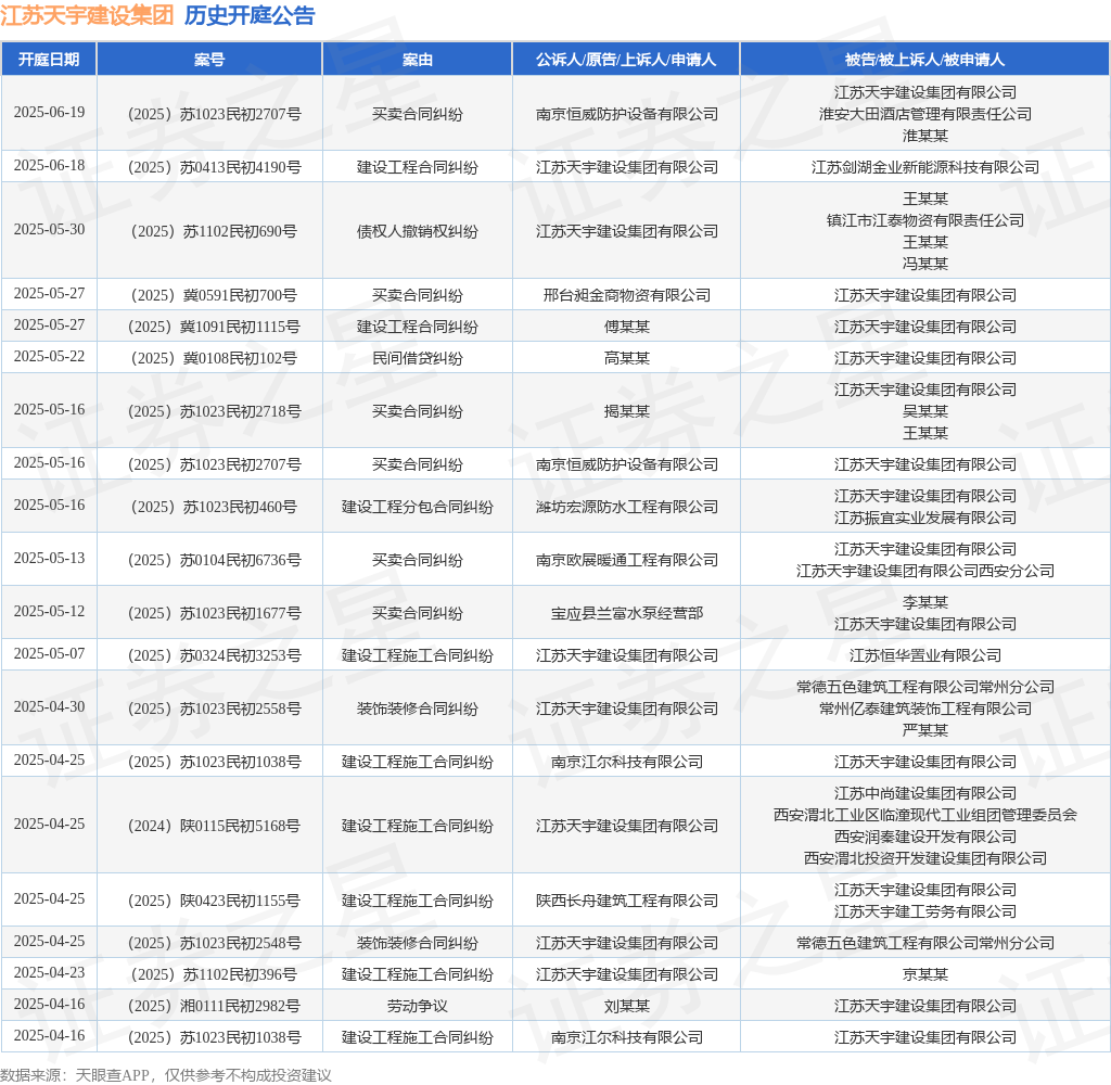 本站消息,根据天眼查APP显示,近日公布了一则江苏天宇建设集团有限公司作为被告/被上诉人的开庭公告,详细内容如下: